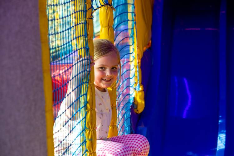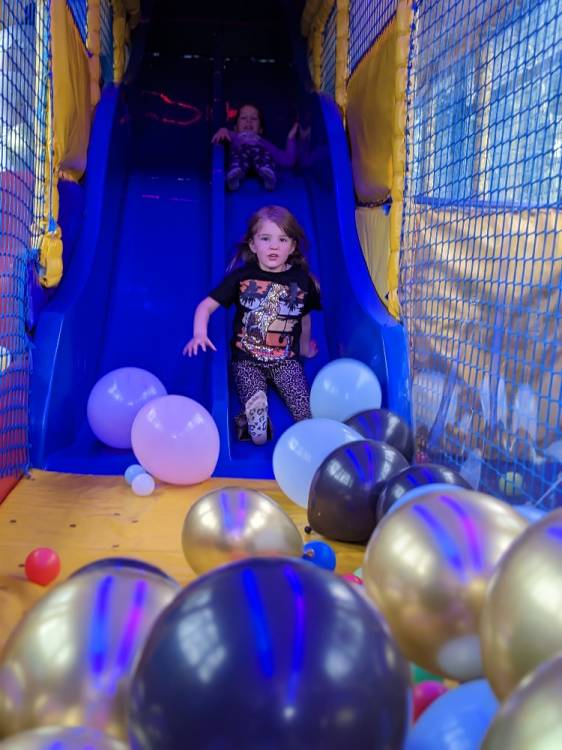 A double decker Bus converted into a soft play centre with racing slides, ball pit, soft assault course, music and party lights.
